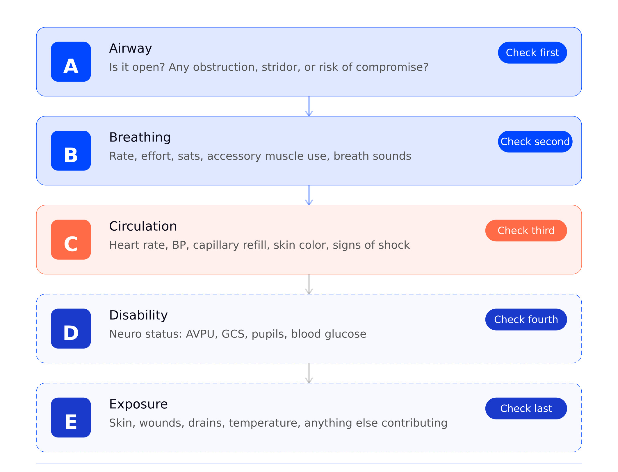 It's the structured order for assessing a critically ill or rapidly deteriorating patient. The logic is simple: each step addresses the most immediately life-threatening problem before moving to the next. You don't worry about a patient's neurological status (Disability) if their airway isn't open.