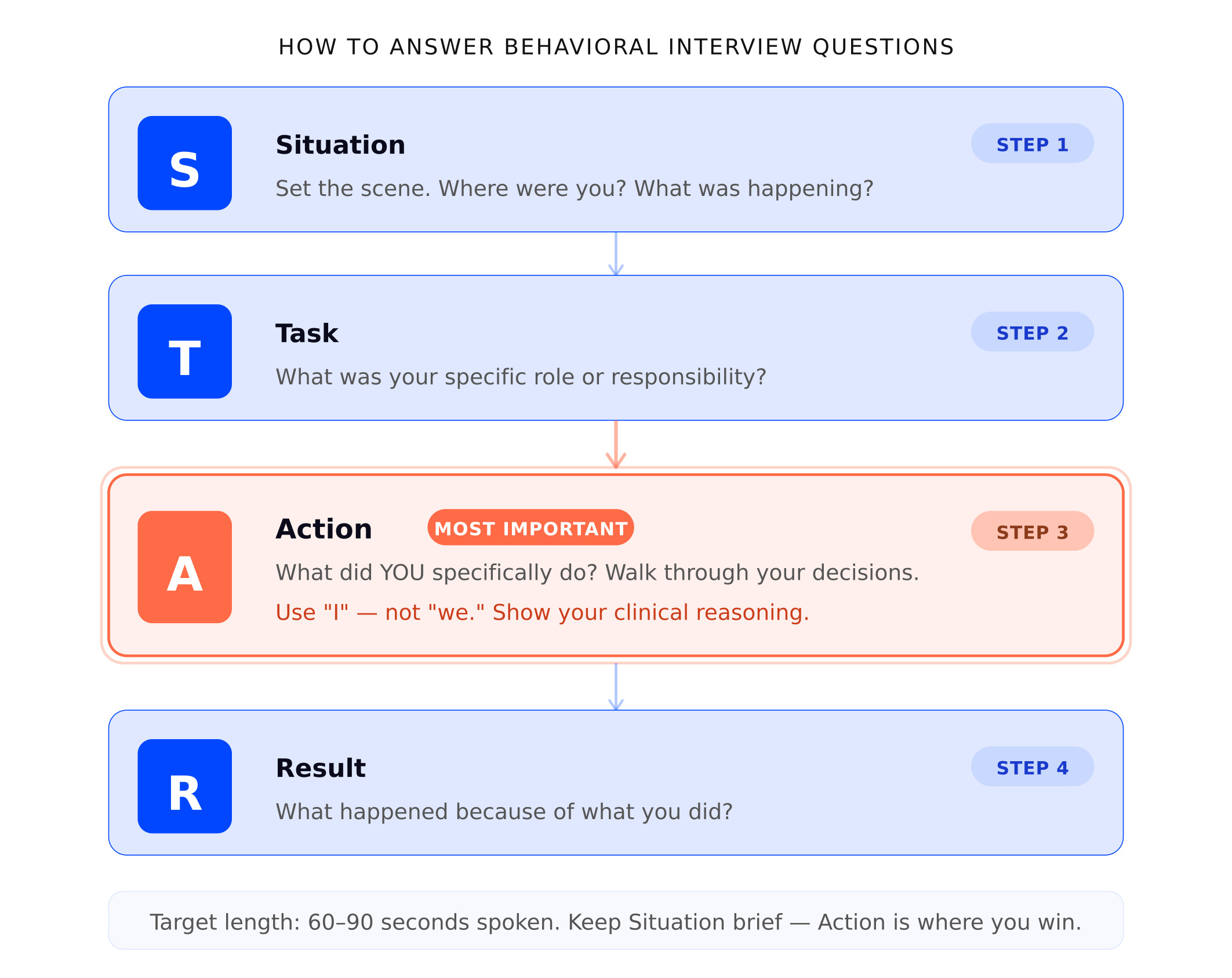 Prepare five real stories from your clinical experience. Practice them out loud. Keep your Situation brief, your Action specific, and your Result honest.